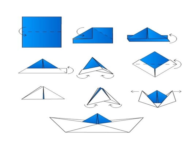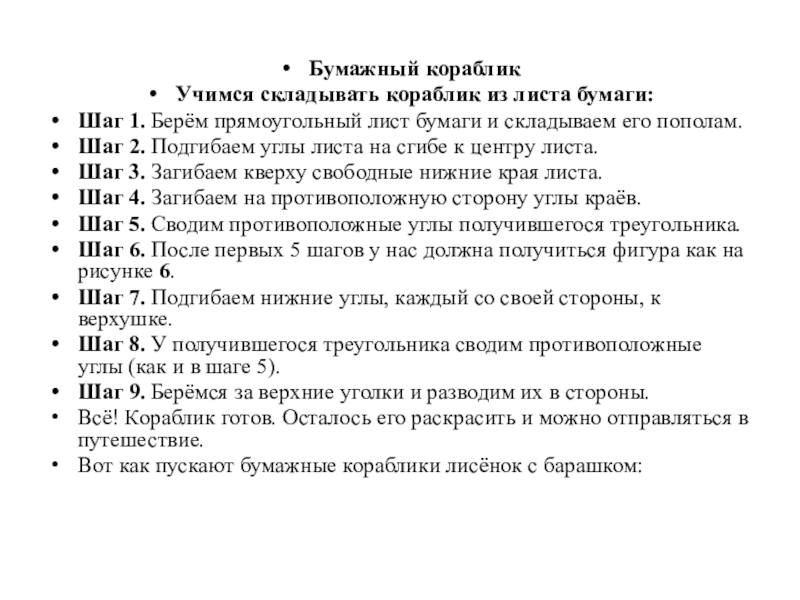 Бумажный корабликУчимся складывать кораблик из листа бумаги:Шаг 1. Берём прямоугольный лист бумаги и складываем его пополам.Шаг 2. Подгибаем углы листа на сгибе к центру листа.Шаг 3. Загибаем кверху свободные нижние края листа.Шаг 4. Загибаем на противоположную сторону углы краёв.Шаг 5. Сводим