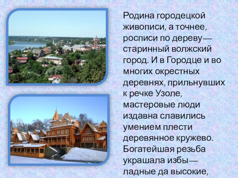 И в Городце и во многих окрестных деревнях, прильнувших к речке Узоле, мастеровые люди издавна славились умением плести деревянное кружево. Богатейшая резьба украшала избы—ладные да высокие, прялки, посуду, игрушки.