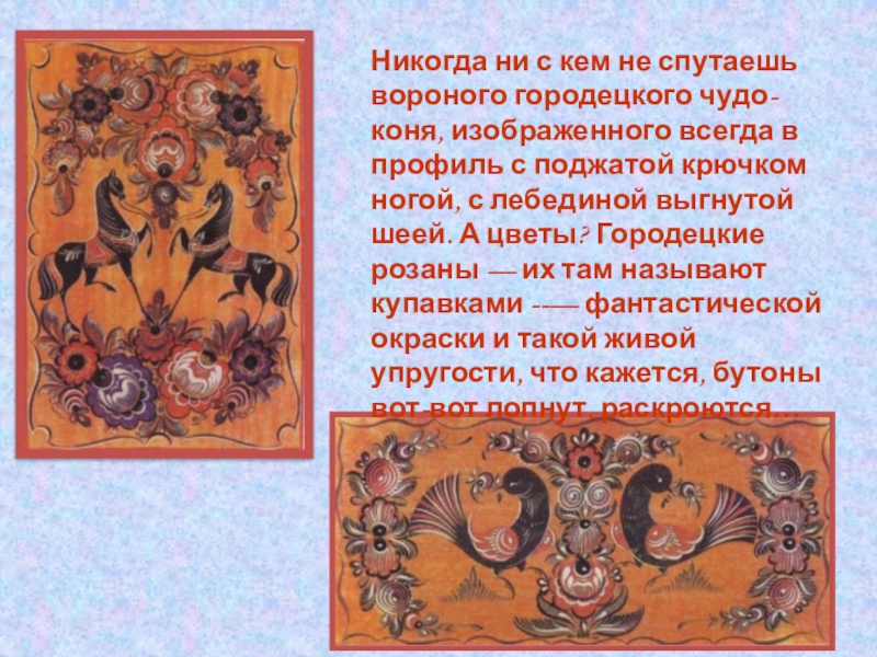 Слайд 12Никогда ни с кем не спутаешь вороного городецкого чудо-коня, изображенного всегда