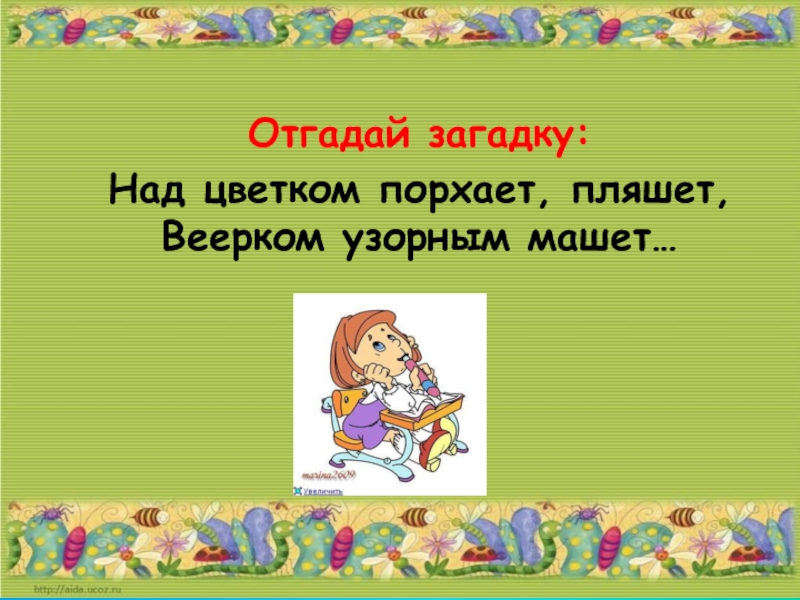 Над цветком порхает, пляшет,  Веерком узорным машет…