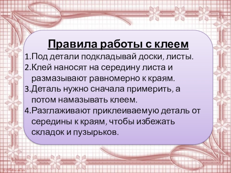 Разглаживают приклеиваемую деталь от середины к краям, чтобы избежать складок и пузырьков.