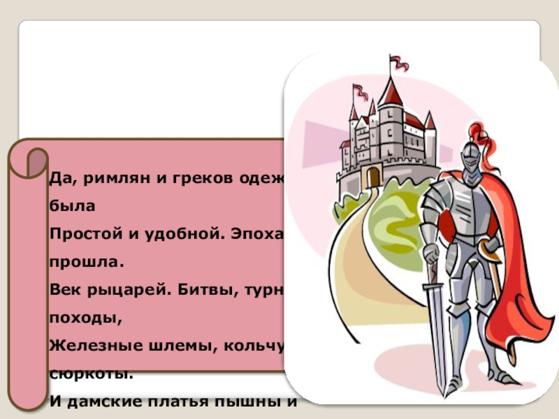 Да, римлян и греков одежда была Простой и удобной. Эпоха прошла.Век рыцарей. Битвы, турниры, походы,Железные шлемы, кольчуги,