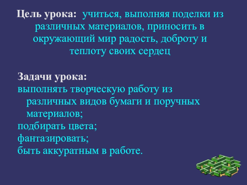 выполнять творческую работу из различных видов бумаги и поручных материалов;