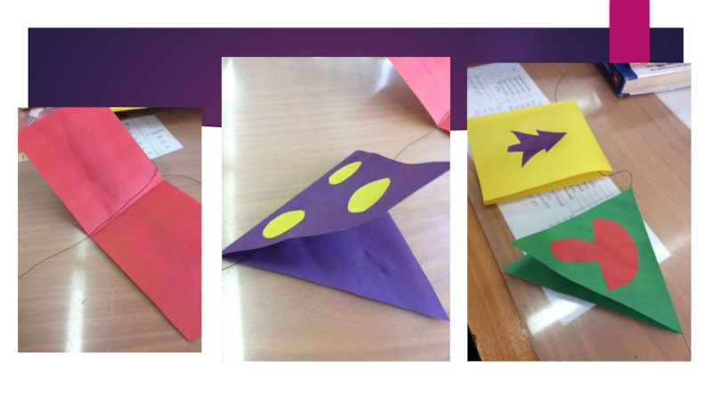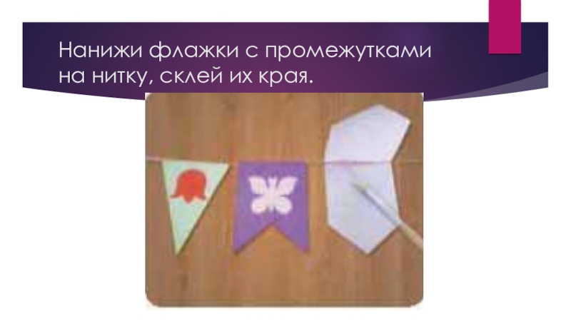 Слайд 6Нанижи флажки с промежутками на нитку, склей их края.