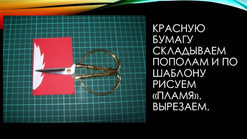 Слайд 5Красную бумагу складываем пополам и по шаблону рисуем «пламя». Вырезаем.
