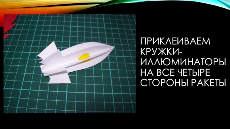 Слайд 11Приклеиваем кружки-иллюминаторы на все четыре стороны ракеты