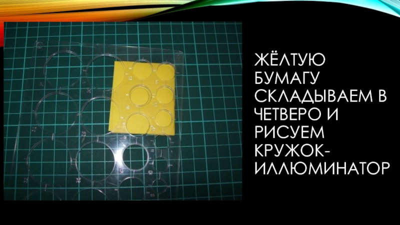 Слайд 10Жёлтую бумагу складываем в четверо и рисуем кружок-иллюминатор