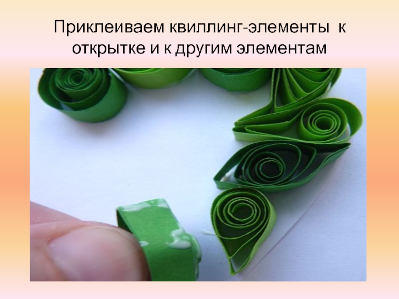 Слайд 5Приклеиваем квиллинг-элементы к открытке и к другим элементам