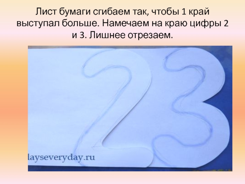 Лист бумаги сгибаем так, чтобы 1 край выступал больше. Намечаем на краю цифры 2 и 3. Лишнее