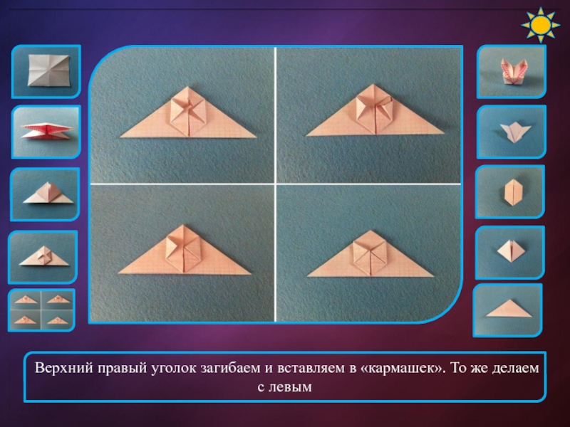 Слайд 8Верхний правый уголок загибаем и вставляем в «кармашек». То же делаем