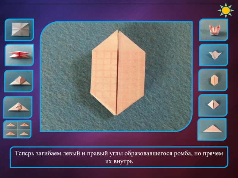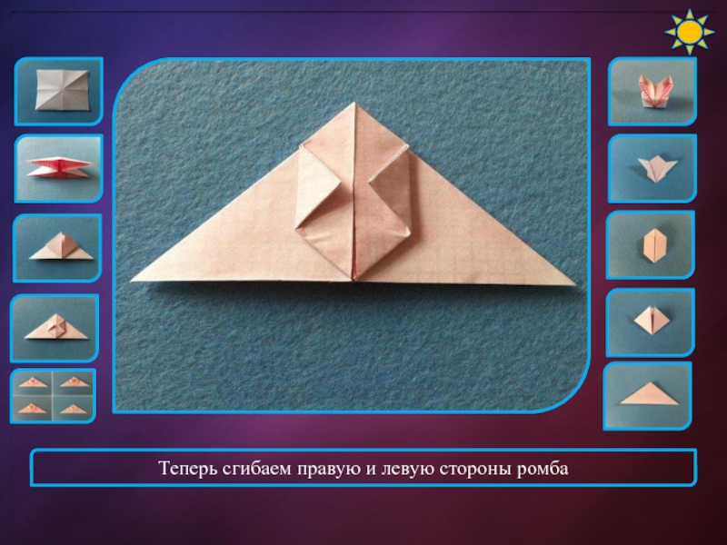 Слайд 7Теперь сгибаем правую и левую стороны ромба
