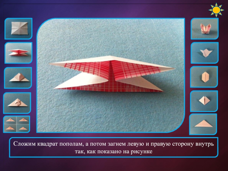 Слайд 5Сложим квадрат пополам, а потом загнем левую и правую сторону внутрь