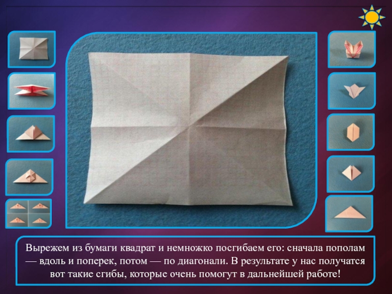 вдоль и поперек, потом — по диагонали. В результате у нас получатся вот такие сгибы, которые очень помогут в дальнейшей работе!