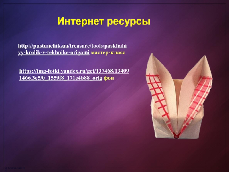 @ Комельских И. П.http://pustunchik.ua/treasure/tools/paskhalnyy-krolik-v-tekhnike-origami мастер-классhttps://img-fotki.yandex.ru/get/137468/134091466.3e5/0_1559f8_171e4b88_orig фонИнтернет ресурсы
