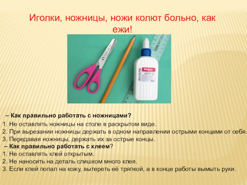 Иголки, ножницы, ножи колют больно, как ежи! – Как правильно работать с ножницами? 1. Не оставлять ножницы
