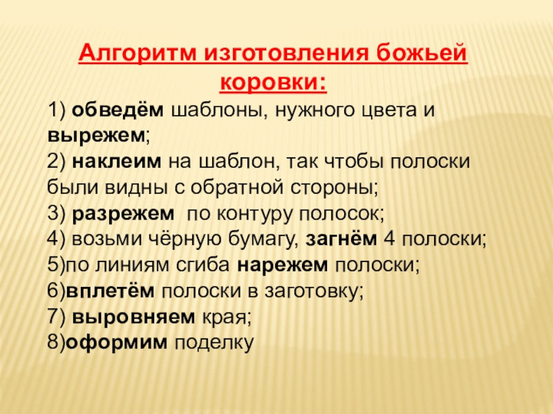 Алгоритм изготовления божьей коровки:1) обведём шаблоны, нужного цвета и  вырежем;2) наклеим на шаблон, так чтобы полоски