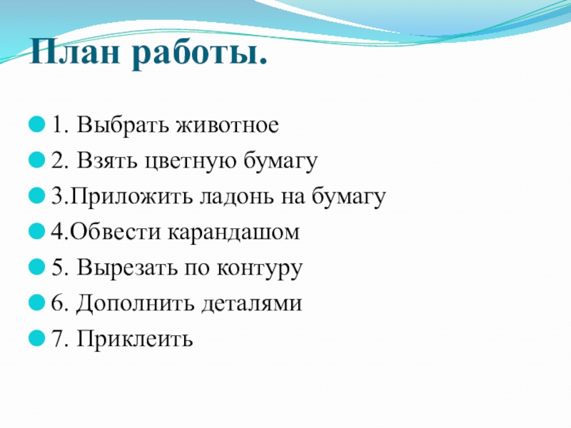 План работы. 1. Выбрать животное2. Взять цветную бумагу3.Приложить ладонь на бумагу4.Обвести карандашом5. Вырезать по контуру6. Дополнить деталями7.
