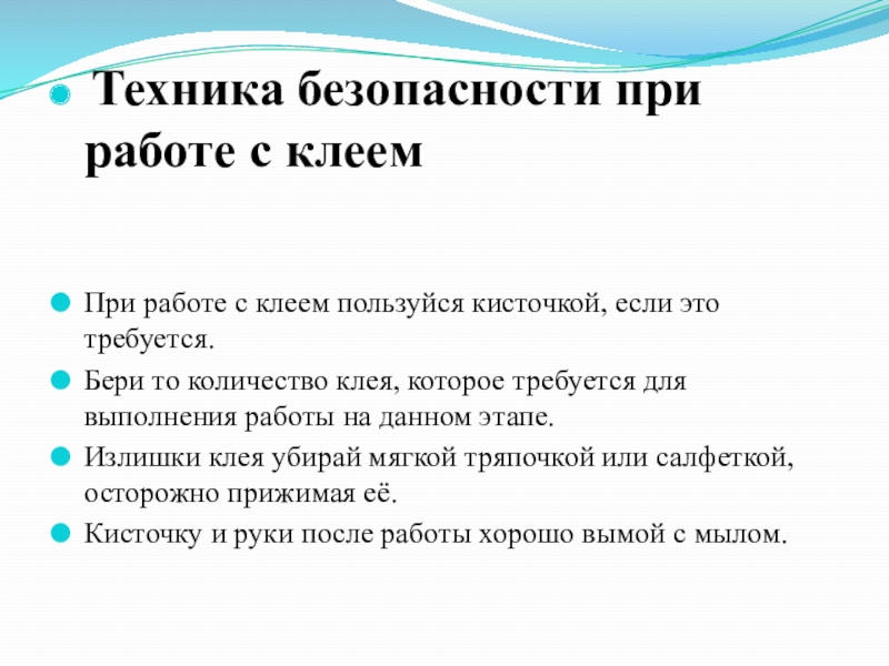 Техника безопасности при работе с клеемПри работе с клеем пользуйся кисточкой, если это требуется.Бери то количество клея,