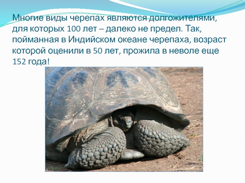 Слайд 5Многие виды черепах являются долгожителями, для которых 100 лет – далеко