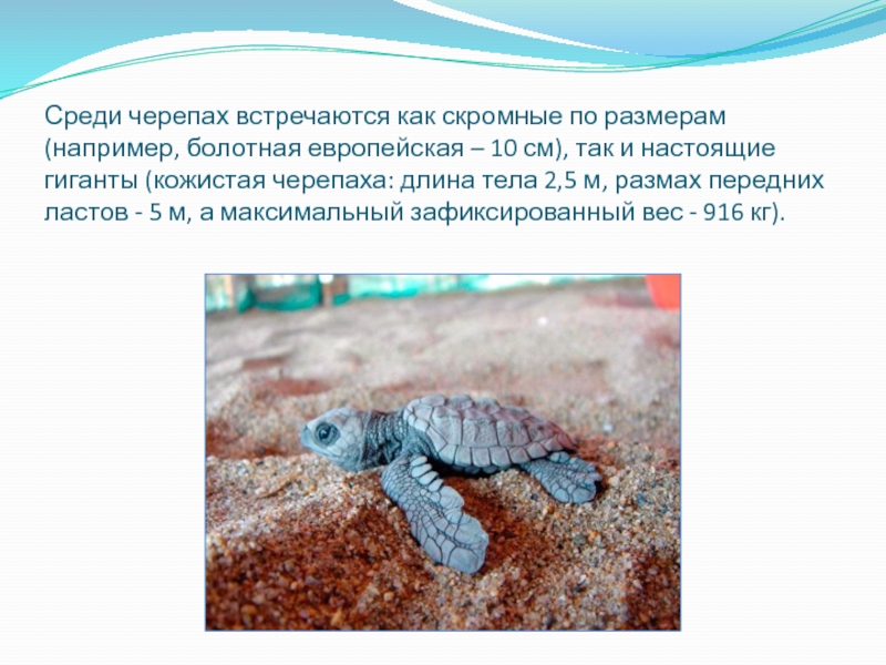 Слайд 7Среди черепах встречаются как скромные по размерам (например, болотная европейская – 10 см),