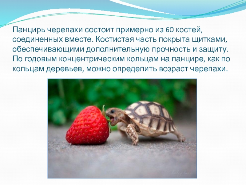 Слайд 10Панцирь черепахи состоит примерно из 60 костей, соединенных вместе. Костистая часть