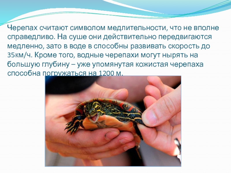 Слайд 9Черепах считают символом медлительности, что не вполне справедливо. На суше они