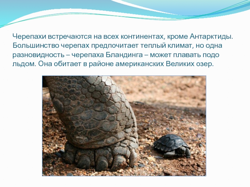 Слайд 6Черепахи встречаются на всех континентах, кроме Антарктиды. Большинство черепах предпочитает теплый