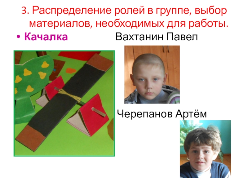 3. Распределение ролей в группе, выбор материалов, необходимых для работы. Качалка