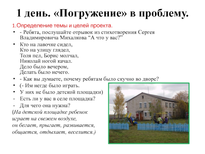1 день. «Погружение» в проблему. 1.Определение темы и целей проекта.- Ребята, послушайте отрывок из стихотворения Сергея Владимировича