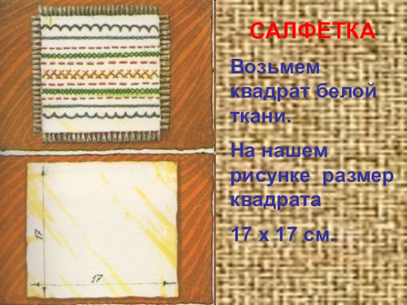 САЛФЕТКАВозьмем квадрат белой ткани. На нашем рисунке размер квадрата 17 х 17 см.