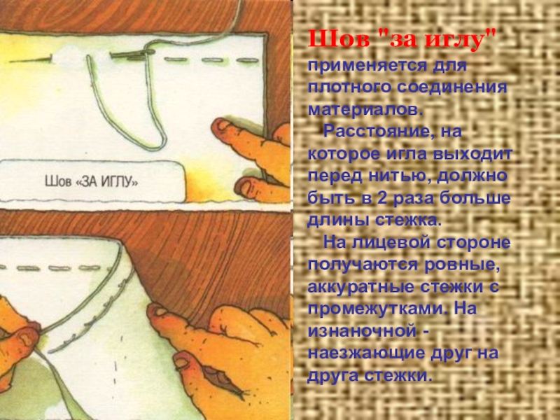 Слайд 4Шов "за иглу" применяется для плотного соединения материалов.