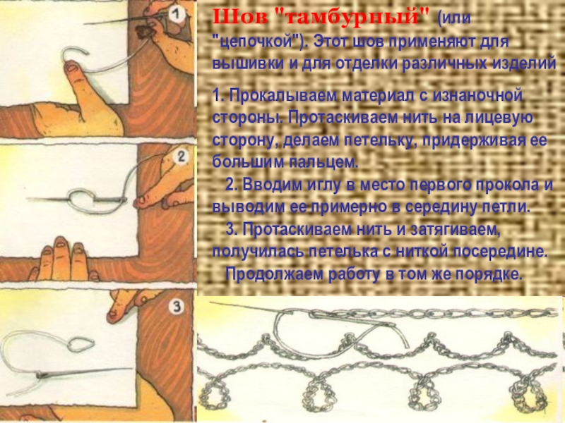 Слайд 5Шов "тамбурный" (или "цепочкой"). Этот шов применяют для вышивки и для