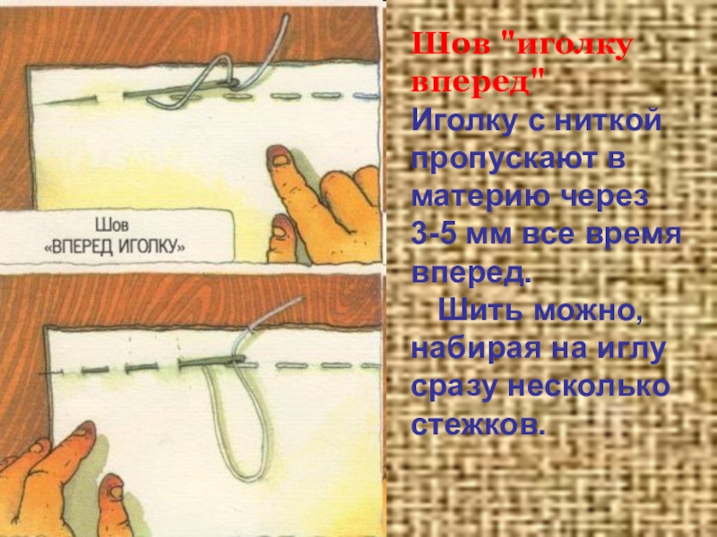 Шов "иголку вперед" Иголку с ниткой пропускают в материю через 3-5 мм все время вперед.   Шить можно, набирая на иглу сразу несколько стежков.