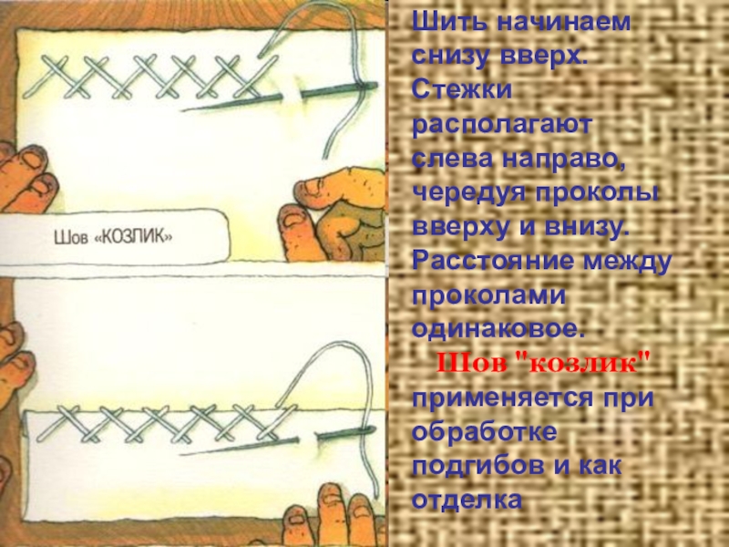 Слайд 8Шить начинаем снизу вверх. Стежки располагают слева направо, чередуя проколы вверху