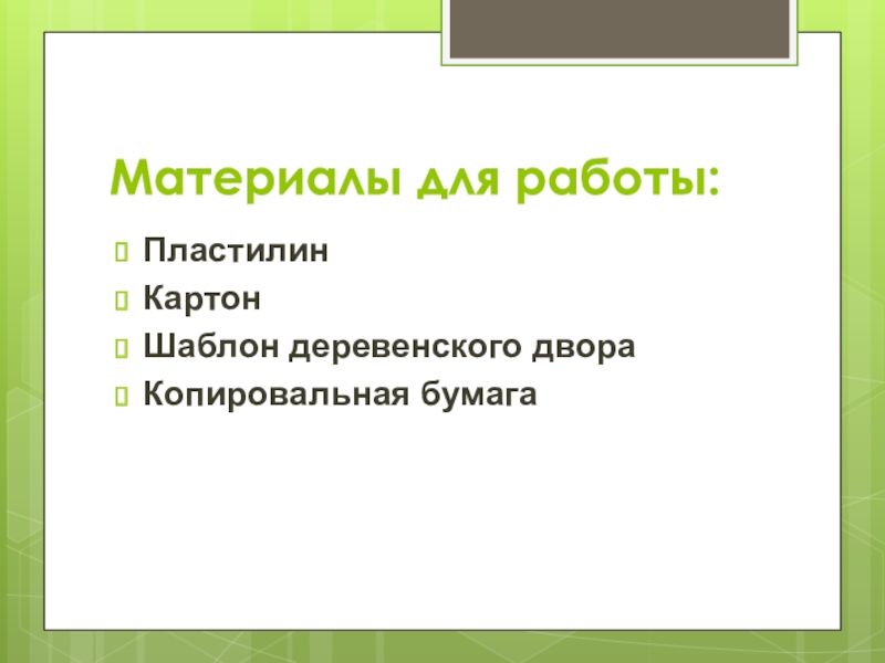 Материалы для работы:ПластилинКартонШаблон деревенского двораКопировальная бумага