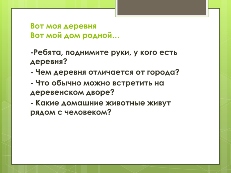 Вот моя деревня Вот мой дом родной… -Ребята, поднимите руки, у кого есть деревня?- Чем деревня отличается от города?- Что обычно можно встретить на деревенском дворе?- Какие домашние животные живут рядом с человеком?
