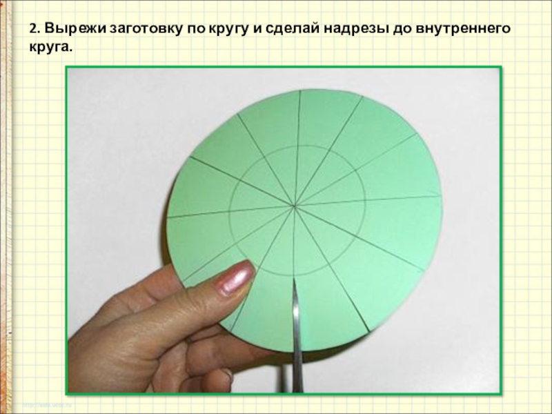 Слайд 32. Вырежи заготовку по кругу и сделай надрезы до внутреннего круга.