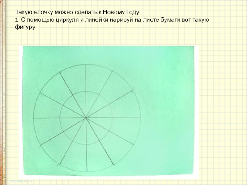 Такую ёлочку можно сделать к Новому Году. 1. С помощью циркуля и линейки нарисуй на листе бумаги