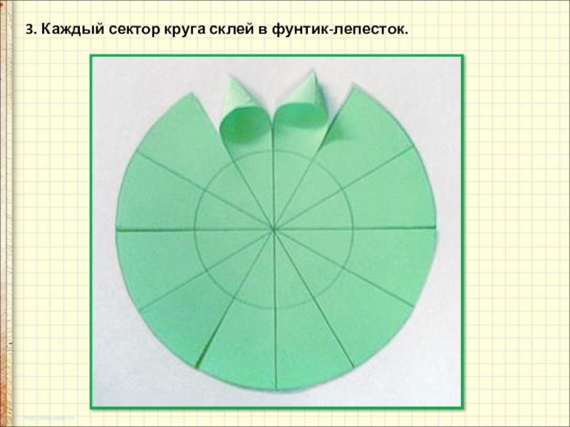 Слайд 43. Каждый сектор круга склей в фунтик-лепесток.