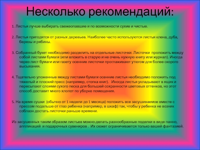 Несколько рекомендаций: 1. Листья лучше выбирать свежеопавшие и по возможности сухие и чистые.2. Листья пригодятся от разных деревьев. Наиболее часто используются листья клена, дуба, березы и рябины.3. Собранный букет необходимо разделить на отдельные листочки. Листочки проложить