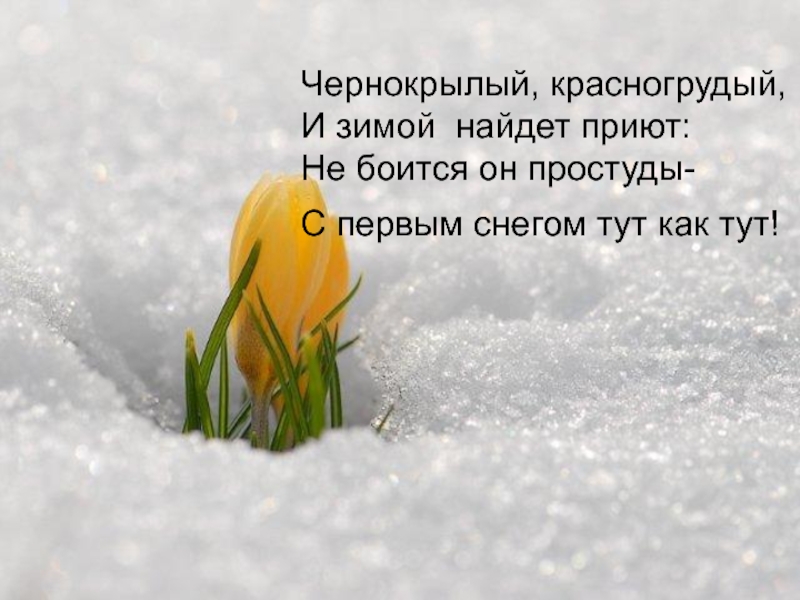Слайд 3Чернокрылый, красногрудый, И зимой найдет приют: Не боится он простуды- С первым снегом