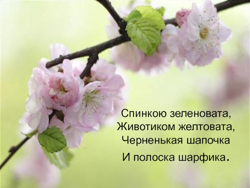 Слайд 5Спинкою зеленовата, Животиком желтовата, Черненькая шапочка И полоска шарфика.