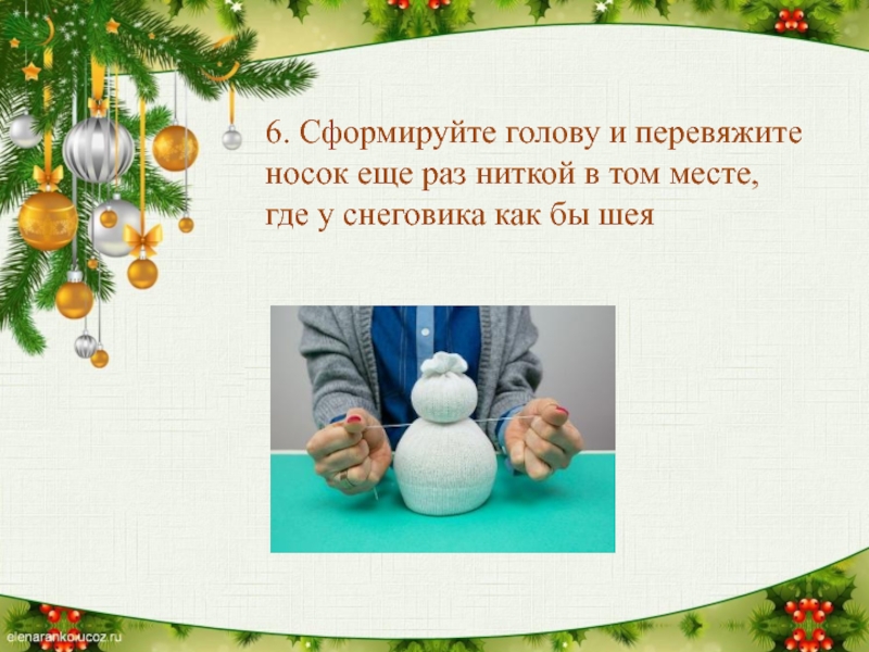 6. Сформируйте голову и перевяжите носок еще раз ниткой в том месте, где у снеговика как бы