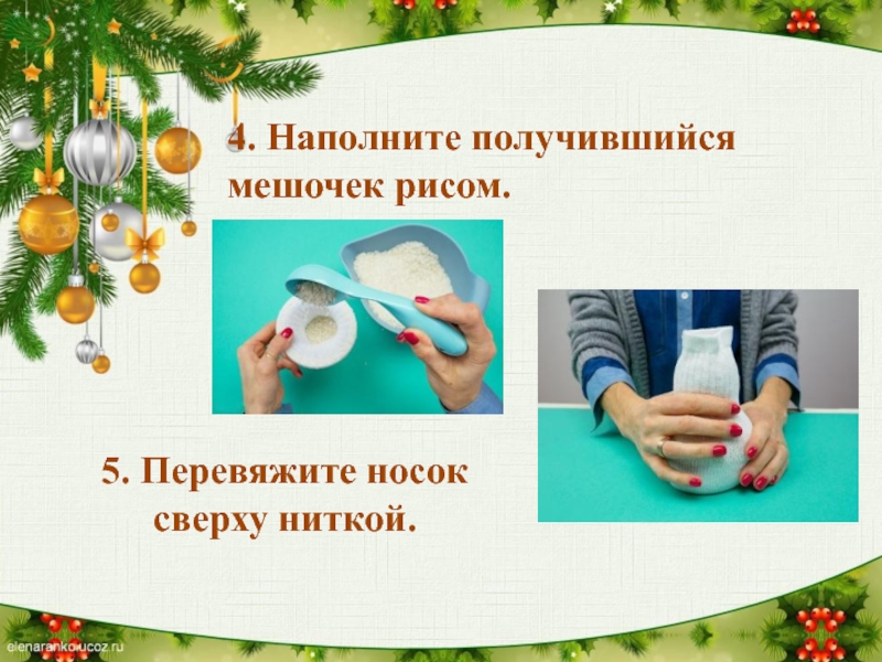 4. Наполните получившийсямешочек рисом. 5. Перевяжите носок сверху ниткой.
