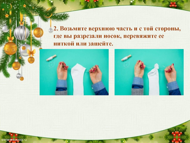 2. Возьмите верхнюю часть и с той стороны, где вы разрезали носок, перевяжите ее ниткой или зашейте.