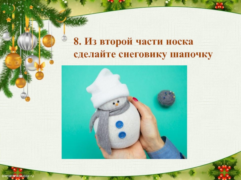 Слайд 98. Из второй части носка сделайте снеговику шапочку
