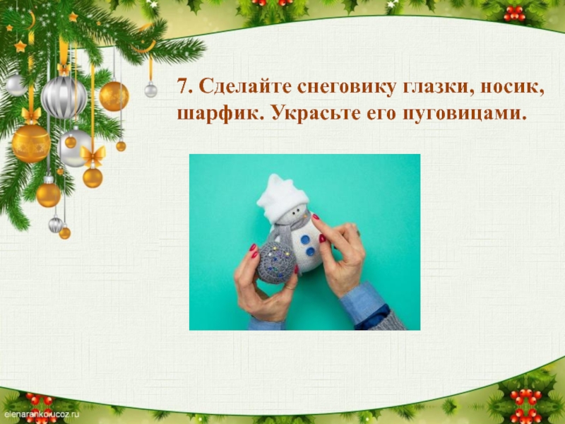 7. Сделайте снеговику глазки, носик, шарфик. Украсьте его пуговицами.