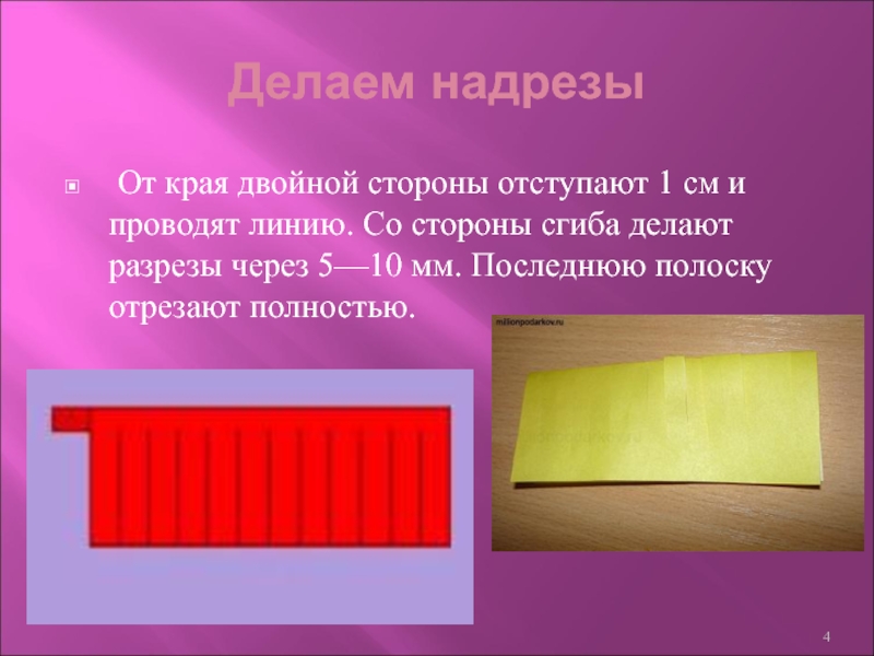 линию. Со стороны сгиба делают разрезы через 5—10 мм. Последнюю полоску отрезают полностью.
