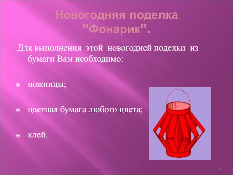 Новогодняя поделка "Фонарик".Для выполнения этой новогодней поделки из бумаги Вам необходимо:ножницы;цветная бумага любого цвета;клей.