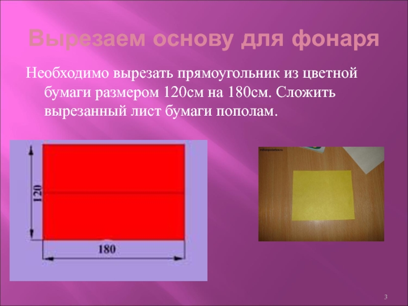 Вырезаем основу для фонаряНеобходимо вырезать прямоугольник из цветной бумаги размером 120см на 180см. Сложить вырезанный лист бумаги
